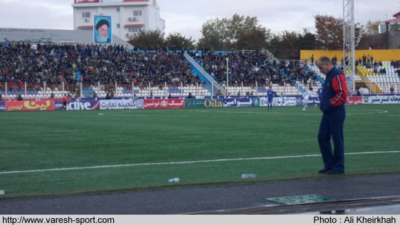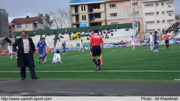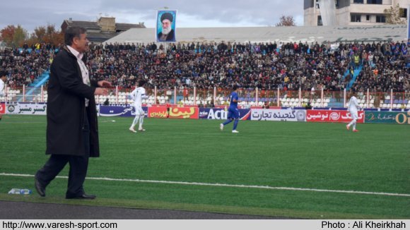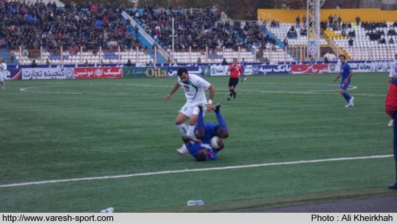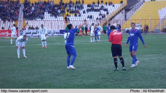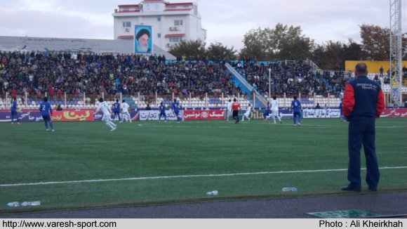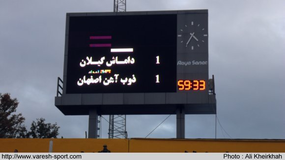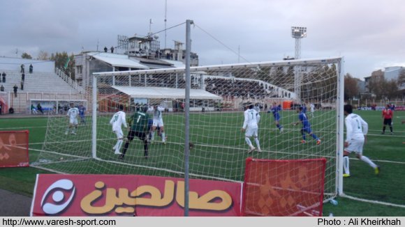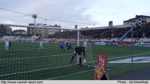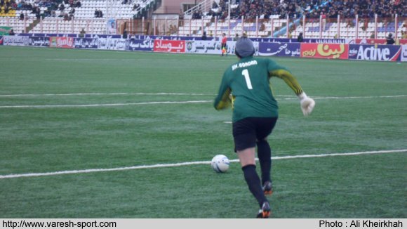 شهاب گردان در حال بیرون کشیدن توپ سرکشی که توسط میلاد زنیدپور نواخته شد و گل تساوی داماش به ثمر رسید