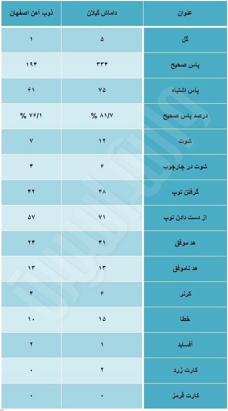 وارش اسپرت – تارنمای هواداران داماش گیلان: در این مطلب آمار کلی عملکرد دو تیم داماش گیلان و ذوب آهن اصفهان در برخی پارامترها مورد بررسی قرار گرفته است.