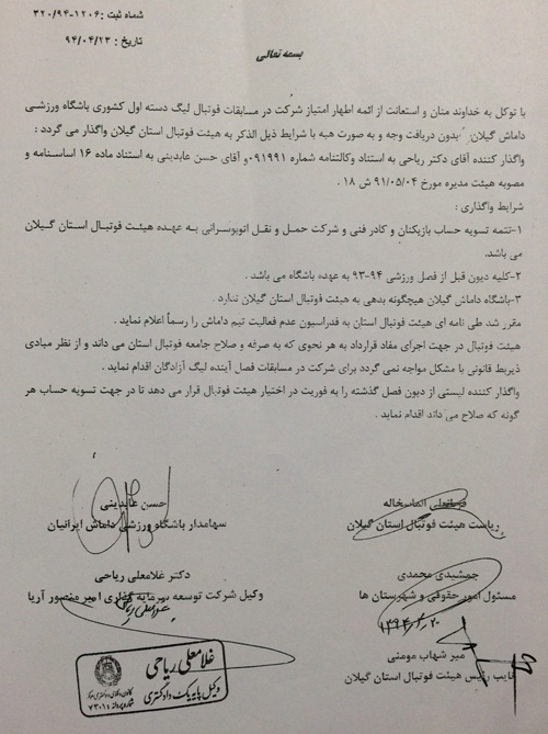 روز 23 تیر ماه 1394، توافق نامه ای به امضای الماسخاله رئیس هیات فوتبال گیلان، امیر عابدینی عضو هیات مدیره باشگاه داماش ایرانیان و همچنین ریاحی وکیل شرکت توسعه سرمایه گذاری امیر منصور آریا می رسد که طی آن امتیاز تیم فوتبال داماش گیلان به هیات فوتبال استان گیلان واگذار شد. 24 ساعت بعد نیز لغو (نه انحلال) فعالیت های "شرکت باشگاه ورزشی داماش ایرانیان" اعلام می شود.