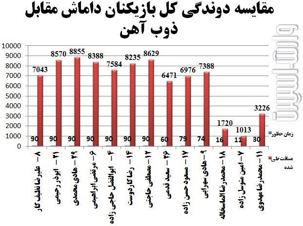 دقایق حضور در زمین هر بازیکن در کنار هر میله از نمودار مشخص شده است.