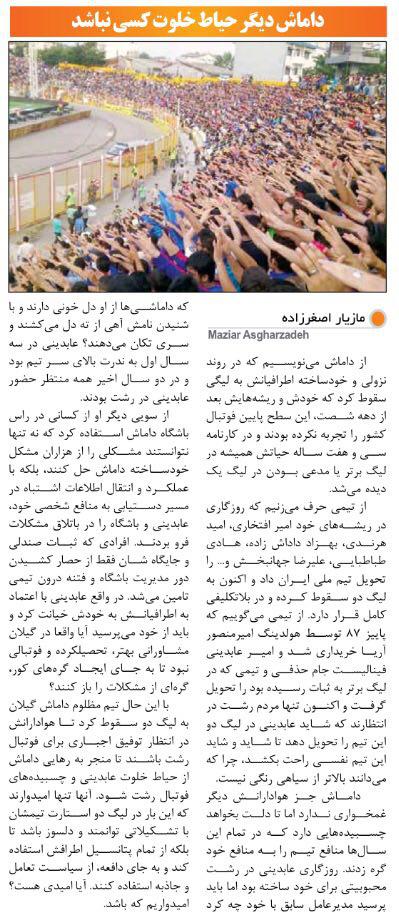 با این حال تیم مظلوم داماش گیلان به لیگ دو سقوط کرد تا هوادارانش در انتظار توفیق اجباری برای فوتبال رشت باشند تا منجر به رهایی داماش از حیاط خلوت عابدینی و چسبیده های فوتبال رشت شود. آنها تنها امیدوارند که این بار در لیگ دو استارت تیم شان با تشکیلاتی توانمند و دلسوز باشد، تا بلکه از تمام پتانسیل اطرافش استفاده کند و به جای دافعه ، از سیاست تعامل و جاذبه استفاده نمایند!